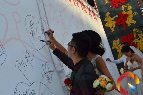 下午5:30分,百對新人集體婚禮正式開始,來自凱里學院的志愿者帶領每十對為一組的新人緩緩入場,入場后新人從志愿者手上接過黑色筆在文化墻上留下雙方的名字,并用一個大心框住兩人的名字作為愛的印記。