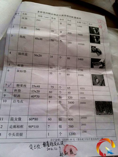 記者從靳秀麗提供給譚某的清單上看見,譚某向其訂購有抱枕、床旗、銀畫、百鳥衣、走廊相框以及牛頭苗銀等物件,訂購單下方空白處寫著“貨已收,數量核實無誤”并簽有人名和蓋有手印。