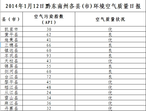 2014年1月12日黔東南州各縣(市)環境空氣質量日報