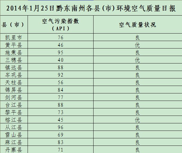 2014年1月25日黔東南州各縣(市)環(huán)境空氣質(zhì)量日?qǐng)?bào)