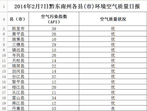 2014年2月7日黔東南州各縣(市)環(huán)境空氣質量日報