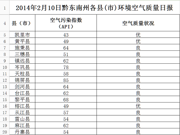 2014年2月10日黔東南州各縣(市)環境空氣質量日報