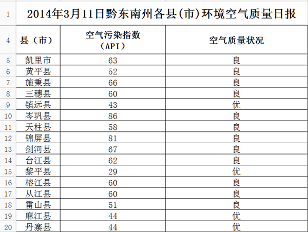 2014年3月11日黔東南州各縣(市)環(huán)境空氣質(zhì)量日?qǐng)?bào)