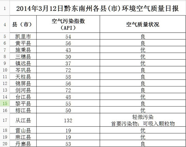 2014年3月12日黔東南州各縣(市)環(huán)境空氣質(zhì)量日報
