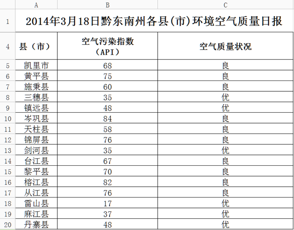 2014年3月18日黔東南州各縣(市)環(huán)境空氣質(zhì)量日報