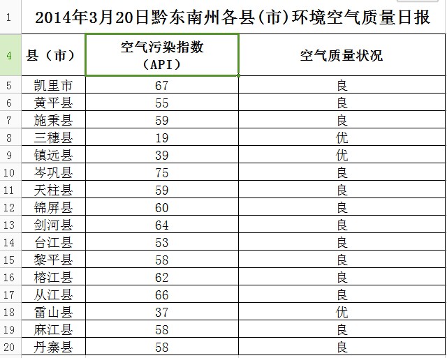 2014年3月20日黔東南州各縣(市)環(huán)境空氣質(zhì)量日?qǐng)?bào)