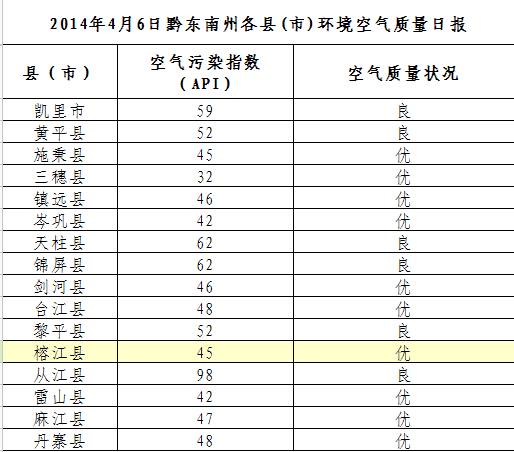 2014年4月6日黔東南州各縣(市)環境空氣質量日報
