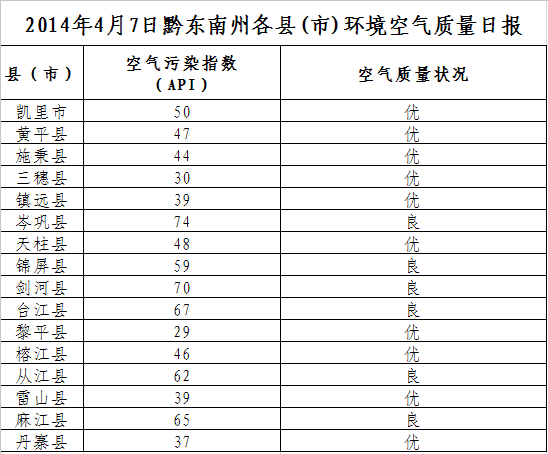 2014年4月7日黔東南州各縣(市)環(huán)境空氣質(zhì)量日報(bào)