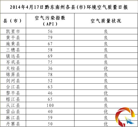 2014年4月17日黔東南州各縣(市)環境空氣質量日報