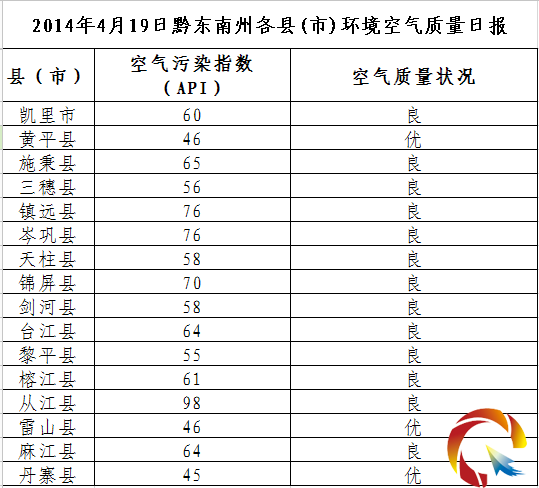 2014年4月19日黔東南州各縣(市)環境空氣質量日報