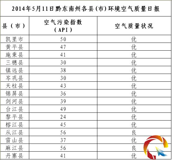 2014年5月11日黔東南州各縣(市)環境空氣質量日報
