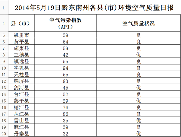 2014年5月19日黔東南州各縣(市)環境空氣質量日報