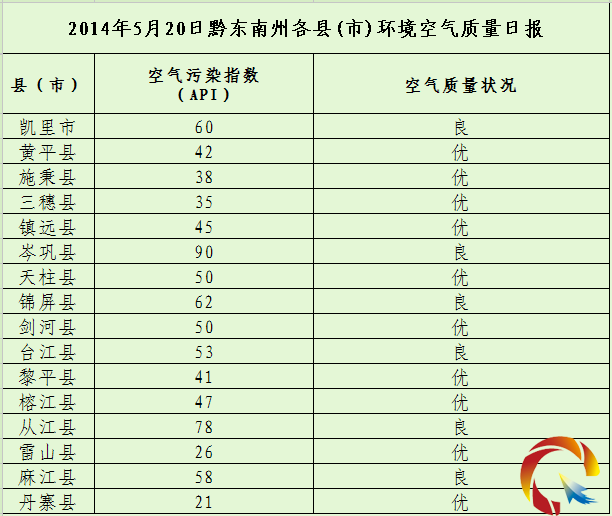 2014年5月20日黔東南州各縣(市)環境空氣質量日報