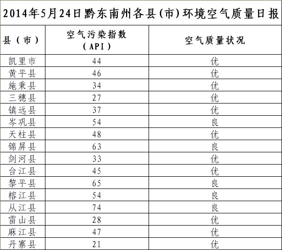 2014年5月24日黔東南州各縣(市)環境空氣質量日報