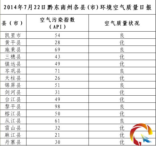 2014年7月22日黔東南州各縣(市)環境空氣質量日報