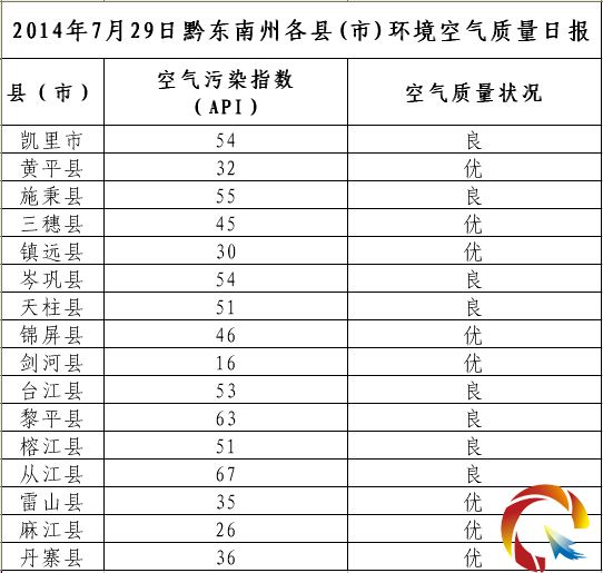 2014年7月29日黔東南州各縣(市)環(huán)境空氣質(zhì)量日報