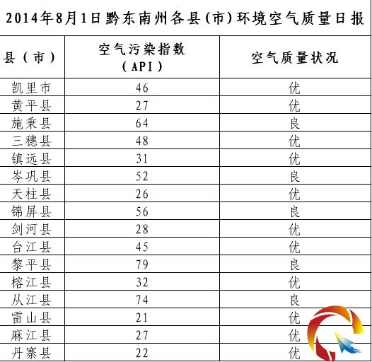 2014年8月1日黔東南州各縣(市)環境空氣質量日報