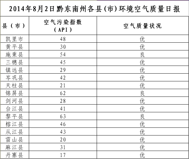 2014年8月2日黔東南州各縣(市)環境空氣質量日報