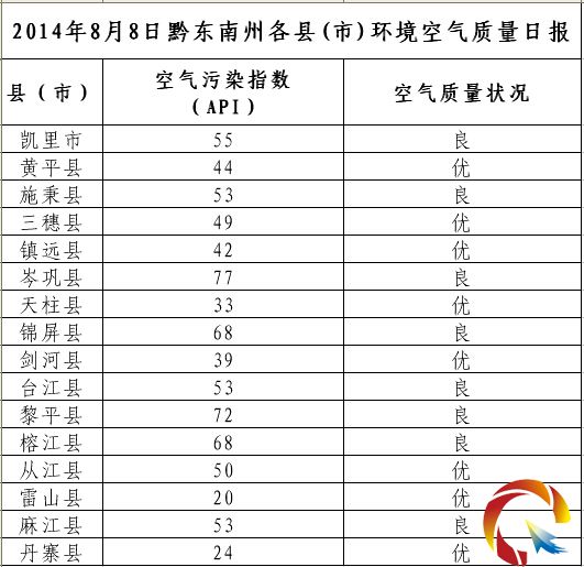 2014年8月8日黔東南州各縣(市)環境空氣質量日報