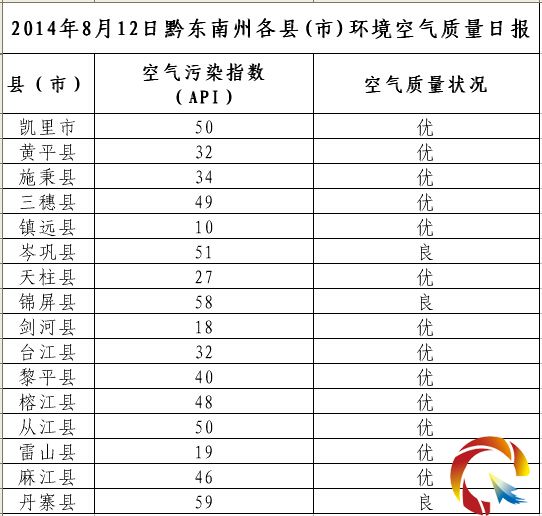 2014年8月12日黔東南州各縣(市)環境空氣質量日報