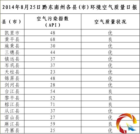 2014年8月25日黔東南州各縣(市)環境空氣質量日報