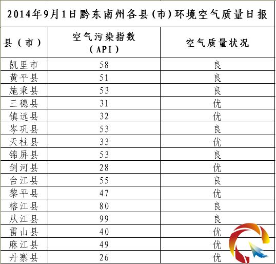 2014年9月1日黔東南州各縣(市)環境空氣質量日報