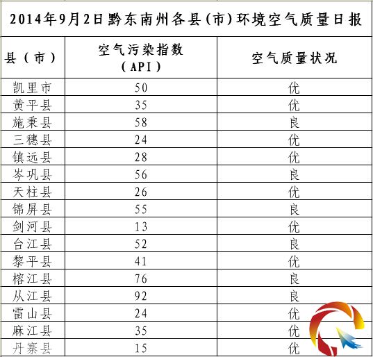 2014年9月2日黔東南州各縣(市)環(huán)境空氣質量日報