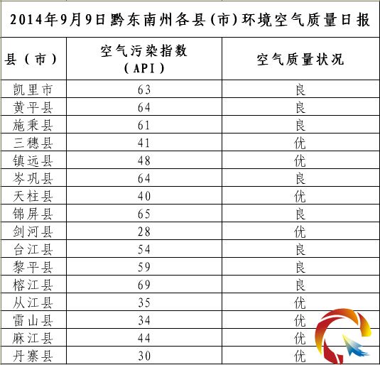 2014年9月9日黔東南州各縣(市)環境空氣質量日報