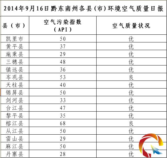 2014年9月16日黔東南州各縣(市)環境空氣質量日報