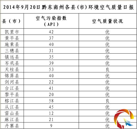 2014年9月20日黔東南州各縣(市)環境空氣質量日報