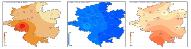 氣溫:9月中旬我州各地平均氣溫為21.3℃(三穗)~25.9℃(榕江) (圖1左),與歷年同期相比偏高0.2℃(鎮遠)~2.7℃(雷山)(圖1中);旬極端最低氣溫16.2℃(丹寨、三穗)~20.6℃(榕江)(圖1右),出現在19~20日;旬極端最高氣溫29.9℃(丹寨)~35.3℃(從江),出現在11日或13日。