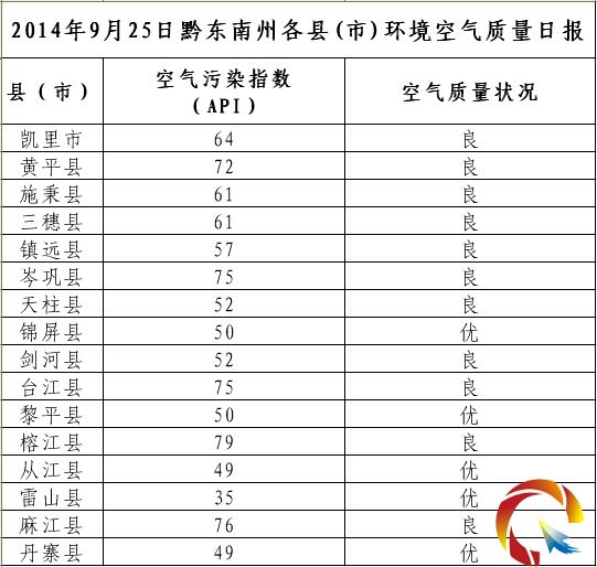 2014年9月25日黔東南州各縣(市)環(huán)境空氣質(zhì)量日?qǐng)?bào)
