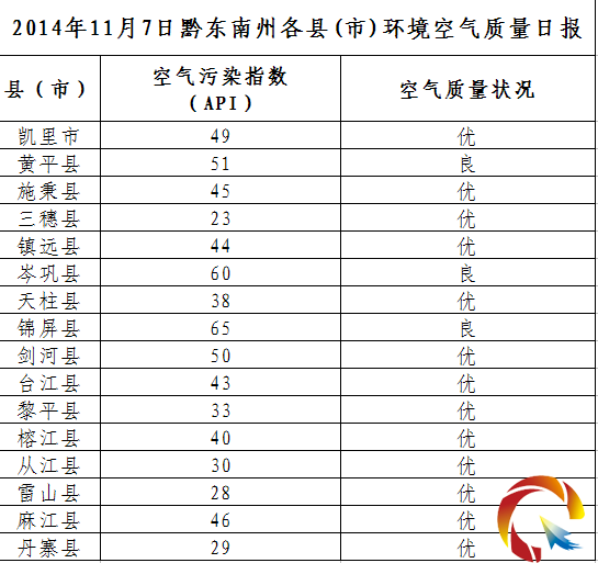 2014年11月7日黔東南州各縣(市)環境空氣質量日報