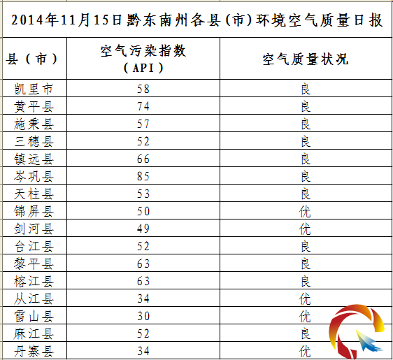 2014年11月15日黔東南州各縣(市)環境空氣質量日報