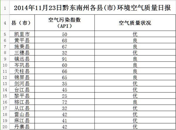 2014年11月23日黔東南州各縣(市)環境空氣質量日報