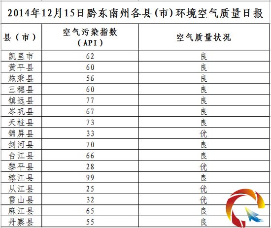 2014年12月15日黔東南州各縣(市)環(huán)境空氣質量日報