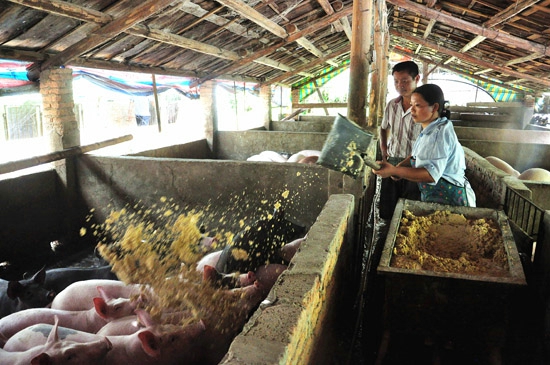 楊文斌和妻子龍建英在喂養豬仔