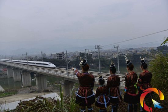 本網訊 12月6日,榕江縣幾位侗族姑娘在貴廣高鐵月寨大橋旁觀看試運行的動車。
