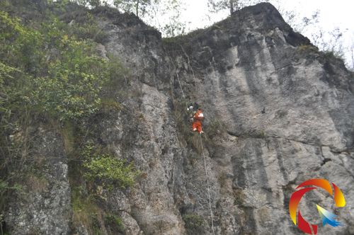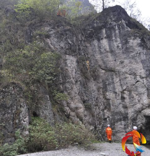14時49分,施秉縣消防大隊接警趕到現場,消防官兵立即詢問現場報警人得知:被困在懸崖半山腰上的少年與這位報警人一起來避暑山莊內游玩,因一點小事兩人發生爭執后,斗氣決定比賽攀巖,當這名少年從地面攀爬上懸崖大約10多米高的位置后,發現自己已經上下兩難,多次試圖原地返回也無效,無奈之下同伴便撥打了119報警求助。