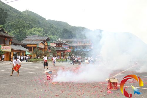 本網訊 6月 25日,世界自然遺產施秉喀斯特核心區云臺山景區大門口牌樓沖廣場,數百發煙花急速騰空,綻放出七彩的美麗,把一幢幢“農家別墅”點綴得“金壁輝煌”。瞬間點燃了鄉親們的激情,一場施秉喀斯特成功申遺集體“打平火”如是上演。近百名海內外游客也前來祝賀、同歡,為趕個吉利、高興,當日牌樓沖村寨對游客吃住實行免費。