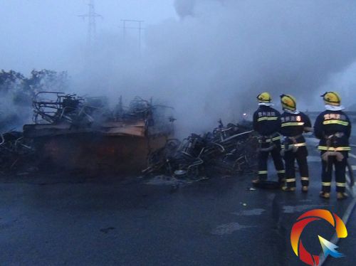 了解情況后,指揮員迅速下令:出一支水槍對車身進行覆蓋滅火,從而全面壓制火災蔓延。經過40分鐘的奮力撲救,明火基本撲滅,但是被燃燒的貨物仍在冒煙,指揮員命令戰斗員利用鏟子將其刨開,再用水槍對其進行撲滅。1小時的過后,確認沒有復燃跡象,將現場轉交給交警部門便收拾歸隊。(王銘玖 龍立煜)