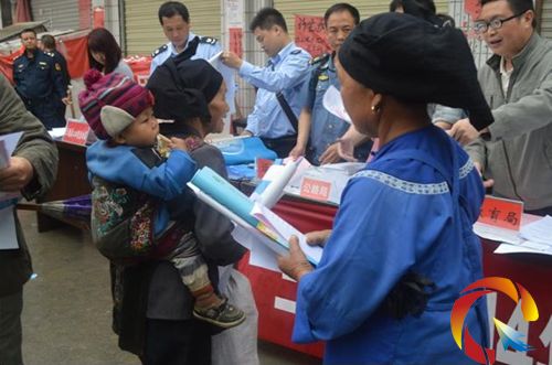 在雪洞和良上宣傳現場,40余名宣傳員向前來索取資料的群眾耐心解答咨詢的各種法律問題。在良上鄉,一位年邁六旬的苗族婦女向工作員詢問如何辨別假幣、沒錢打官司如何申請法律援助等問題,金融部門和縣司法局的同志分別作了細致的解答,直到老人露出滿意的笑容。