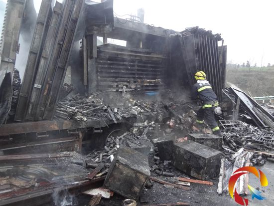 6時12分,劍河大隊到達現場,并出一支水槍控制火勢,從縣城調集的灑水車也陸續趕到,隨后三穗大隊一支水槍、劍河大隊一支水槍和灑水車的水炮對車身發起總攻,6時30分成功將其撲滅。為防止掛車發生復燃,三穗大隊對車身各部位再次進行了降溫,8時30分確定現場已無復燃跡象后,,將現場已移交高速交警處理。