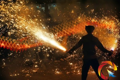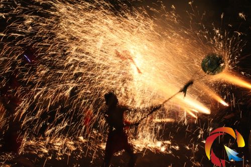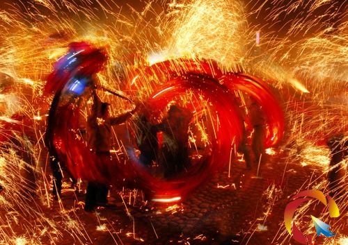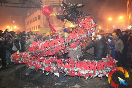 所謂“噓花”,多是用竹筒自制,在竹筒內填滿用硝酸鉀、硫磺、木炭等自配的火藥以及鐵砂、搗碎的玻璃渣等物,壓緊后用泥封口而成噓花筒。這樣的噓花筒大者如碗口,小的也有成人的手腕粗,噴出的噓花可高達十余米,威力驚人。舞龍者則英勇無畏地在焰火中跳躍奔騰,全力拼搏,奮勇前進,場面驚險、刺激、火爆異常。