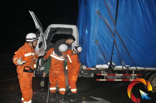 本網訊 5月9日5時許,在滬昆高速臺江至凱里路段,兩輛卡車由于前方堵車,后車車速過快發生追尾事故,造成1名駕駛員被困。臺江消防接警后,立即出動官兵趕赴現場救援。