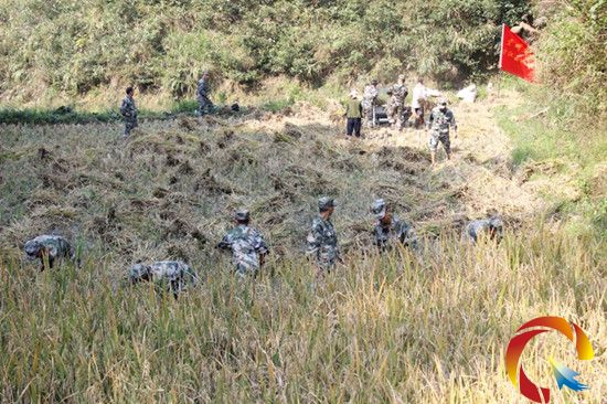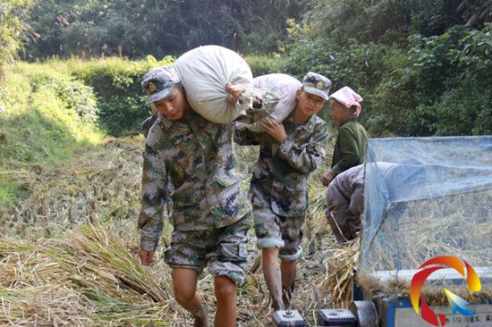 在臺(tái)拱鎮(zhèn)大德村,官兵們了解到該村張老根老漢因兒子張榮成在貴州省安順武警支隊(duì)當(dāng)兵,家里勞動(dòng)力缺乏,幾畝稻田還未收完,若不及時(shí)搶收,一年的好收成將化成泡影,官兵們挽起褲腳走下田間地頭割稻子、打稻谷,運(yùn)稻谷,在各自的“責(zé)任田”忙得不亦樂乎,滿頭大汗、全身是泥全然不覺。
