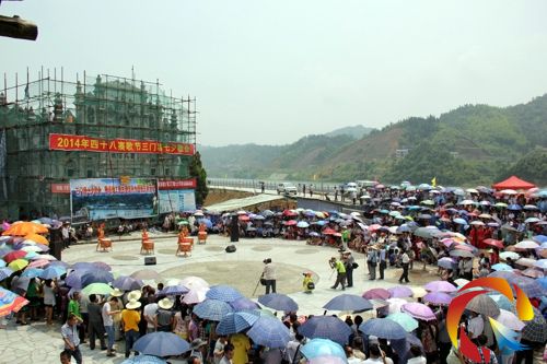 在圍堰竣工等慶祝儀式和七夕歌會上,貴州、湖南兩省的百余支民間歌隊,在三門塘的古樹下、古井邊、古祠旁、古道上、古門前展喉飛歌,現場呈現出了萬人同樂的壯觀場景。(陳光昌 攝影報道)