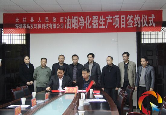 本網訊 11月28日,天柱縣人民政府與深圳市馬發環保科技有限公司達成5億元油煙凈化器生產項目簽約儀式在天柱縣招商和商務局會議室舉行,縣長陸再義代表天柱縣人民政府在簽約席上簽字,縣人大常委會副主任楊紹球、副縣長王興友、縣政協副主席潘海濤、縣工業園區管委會常務副主任黃大為及相關部門代表參加了此次簽約活動。
