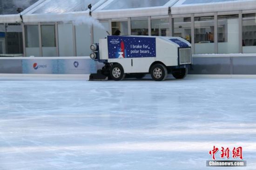 紐約一個(gè)戶外溜冰場(chǎng)工作人員在清理冰面。當(dāng)天紐約氣溫低至零下15度。