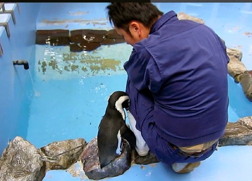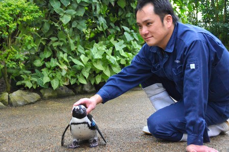 飼養員野津剛與企鵝“小櫻”。